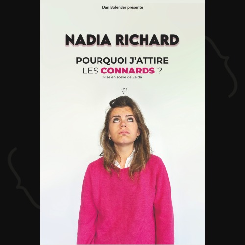 Afficher le planToi aussi, t'en as marre de tomber sur des connards ? Tu es au bon endroit ! Dans son premier spectacle "Pourquoi j'attire les connards ?", Nadia Richard dévoile son histoire avec humour et révèle ses précieux conseils pour reprendre confiance en soi et retrouver le contrôle sur sa vie amoureuse. Nadia Richard est comédienne et créatrice de contenus. Avec humour et une touche de féminisme, elle encourage l'empowerment, la confiance en soi et les relations saines. Plus de 300 000 personnes la suivent déjà sur les réseaux sociaux, séduites par la justesse de ses analyses et son authenticité. Artiste : Nadia Richard Auteure : Nadia Richard Durée : 60/70 mn Spectacle déposé à la SACD
